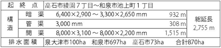 信太山丘陵地の開発に伴い、急激な市街化による下流地域の浸水対策として、昭和44年、王子川都市下水路事業に着手し、14年の歳月をかけ、昭和57年に完成しました。最下流部は、綾園水門から2級河川新王子川に接続し、流下しています。