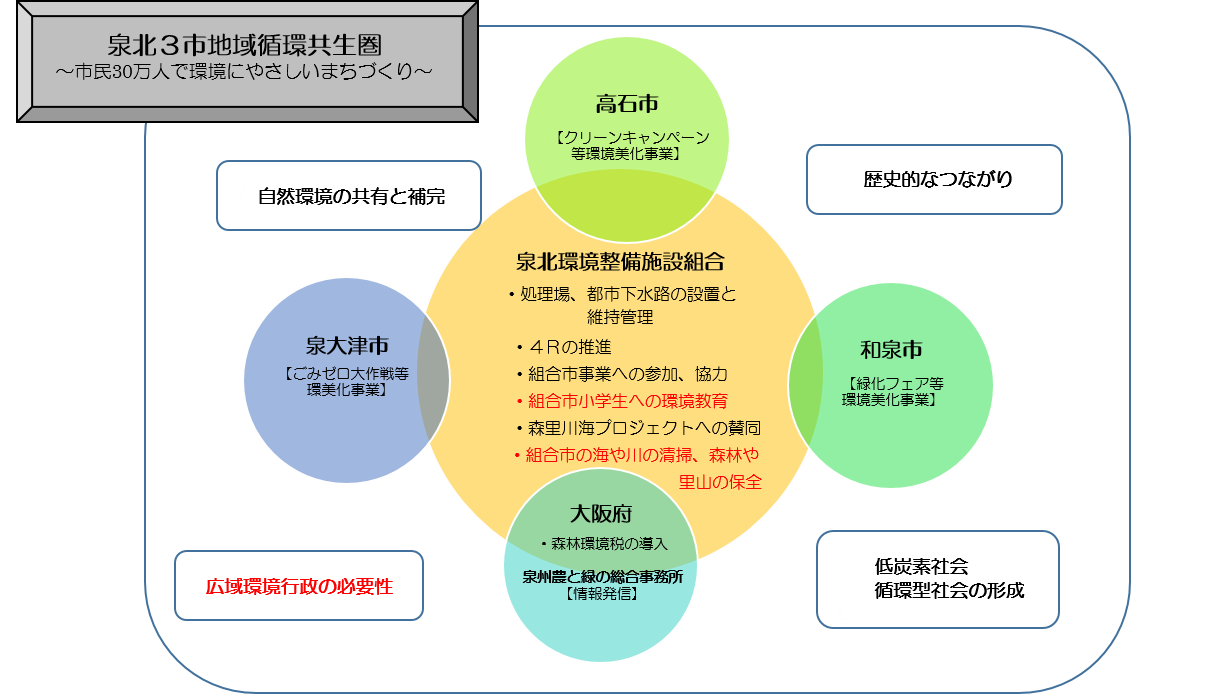 泉大津市と高石市に広がる海、和泉市の緑豊かな森をはじめとし、組合市単独では存在しない自然環境をそれぞれが補う等、古くから生活圏の共有が多く見受けられます。