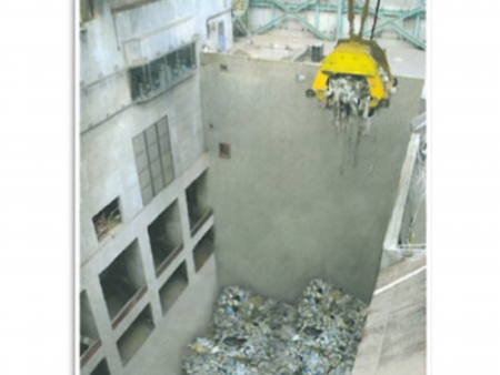 搬入されたごみは、ごみピットに貯蔵し、クレーンによるかくはんと、ごみ投入ホッパへの投入を行います。