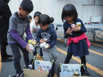 体験コーナーでは、「手選別ゲーム」と「防災扉」を実施しました。手選別ゲームは、エコトピア泉北の資源物選別ラインを体験し、ゲームを通して、ごみの分別やリサイクルの大切さについて学びました。また防災扉では、水害のおそろしさ、水害発生時の行動のあり方について、身をもって体験していただきました。