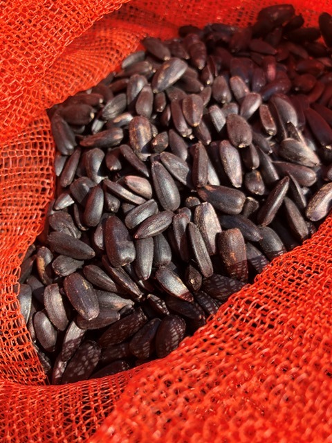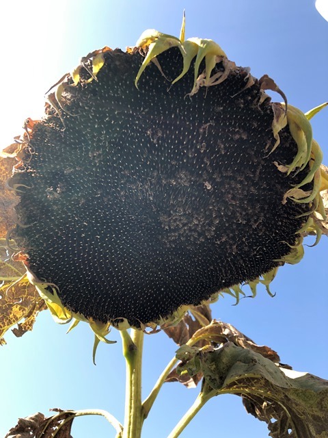 - 咲き終わったひまわりの花をカラカラに乾燥させてから種を取ったよ。